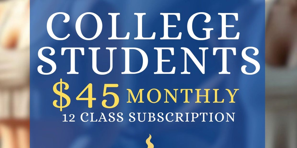 All college students with a valid student ID are eligible for our special rate of $45 per month, which includes up to 12 yoga classes each month.